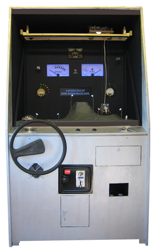 than average game. 40 years ago Neil Armstrong may or may not have fluffed his lines as he stepped on to the moon. Could the anniversary be a better cause to do a Lunar Lander arcade game? Lunar Lander is my second "hand made" arcade machine, and is joins its cousin Cyclepong on Southwold Pier. I love Apollo era technology - all those banks of gages and switches and lights that flash. Very tactile unlike today's uniform monitors . Thunderbirds and other TV programmes of my childhood created a vision of a technical future that's so much more exciting that what we actually ended up with. For Lunar Lander I wanted to make a game that gives a friendly nod the past and also provides a different kind of entertainment to kids used to the sophistication of modern computer games. To land on the moon the Apollo astronauts had to use rocket thrust from the landing module to balance the gravitational pull, while also managing their landing position and fuel consumption. A tricky task (so much so that Apollo 11 landed with only 15 seconds of fuel remaining). This kind of moon landing inspired some of the very first computer games. The defining "Lunar Lander" game was Atari's vector graphics version from 1979. The floating motion of the lander and the smoothness of the vector graphics make it a hypnotic machine. |