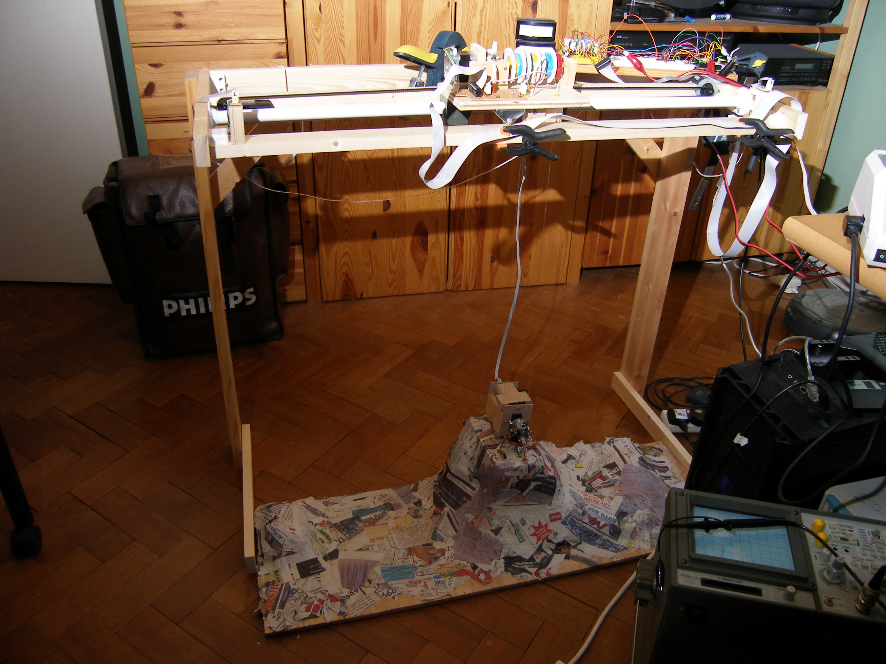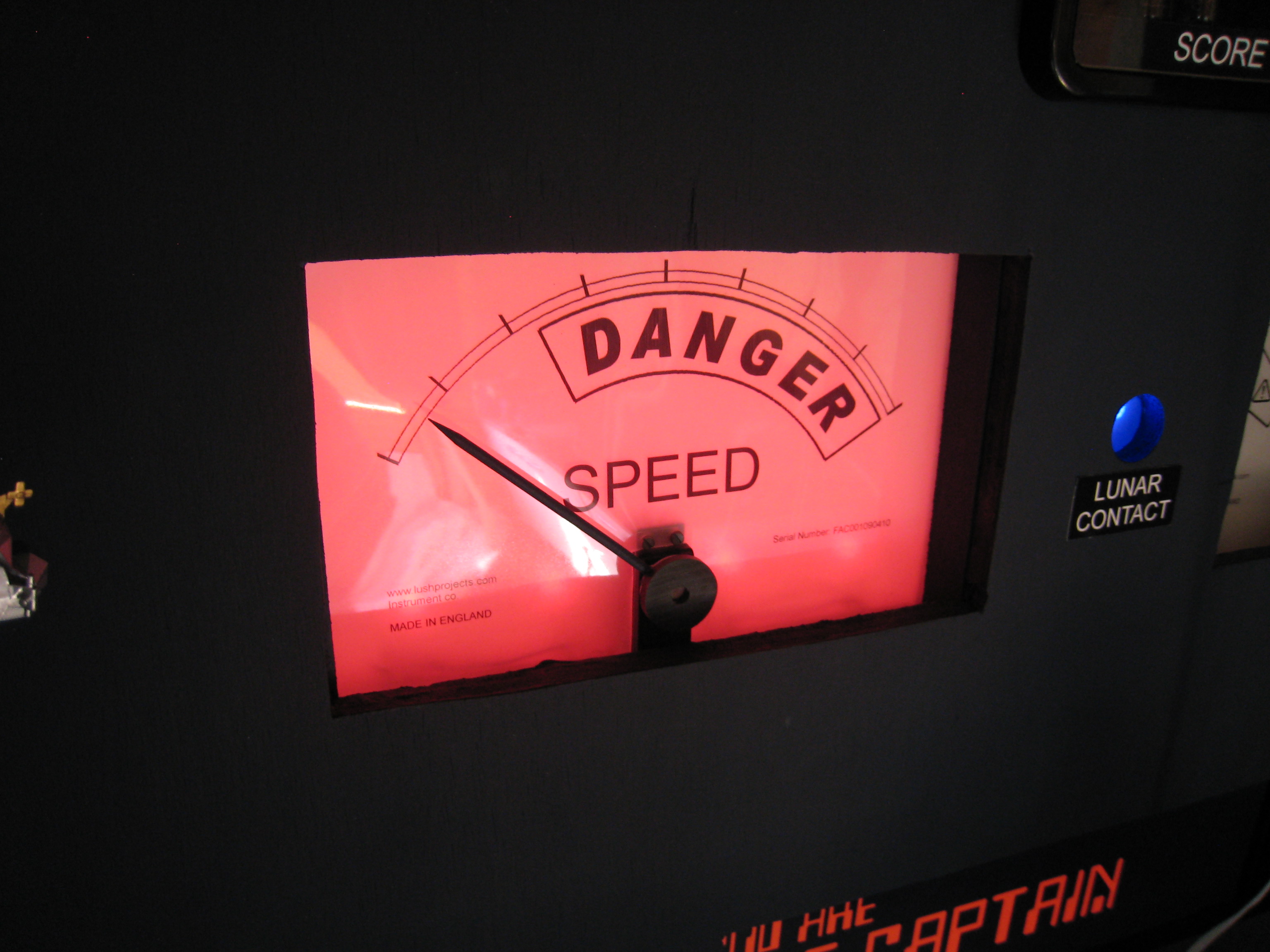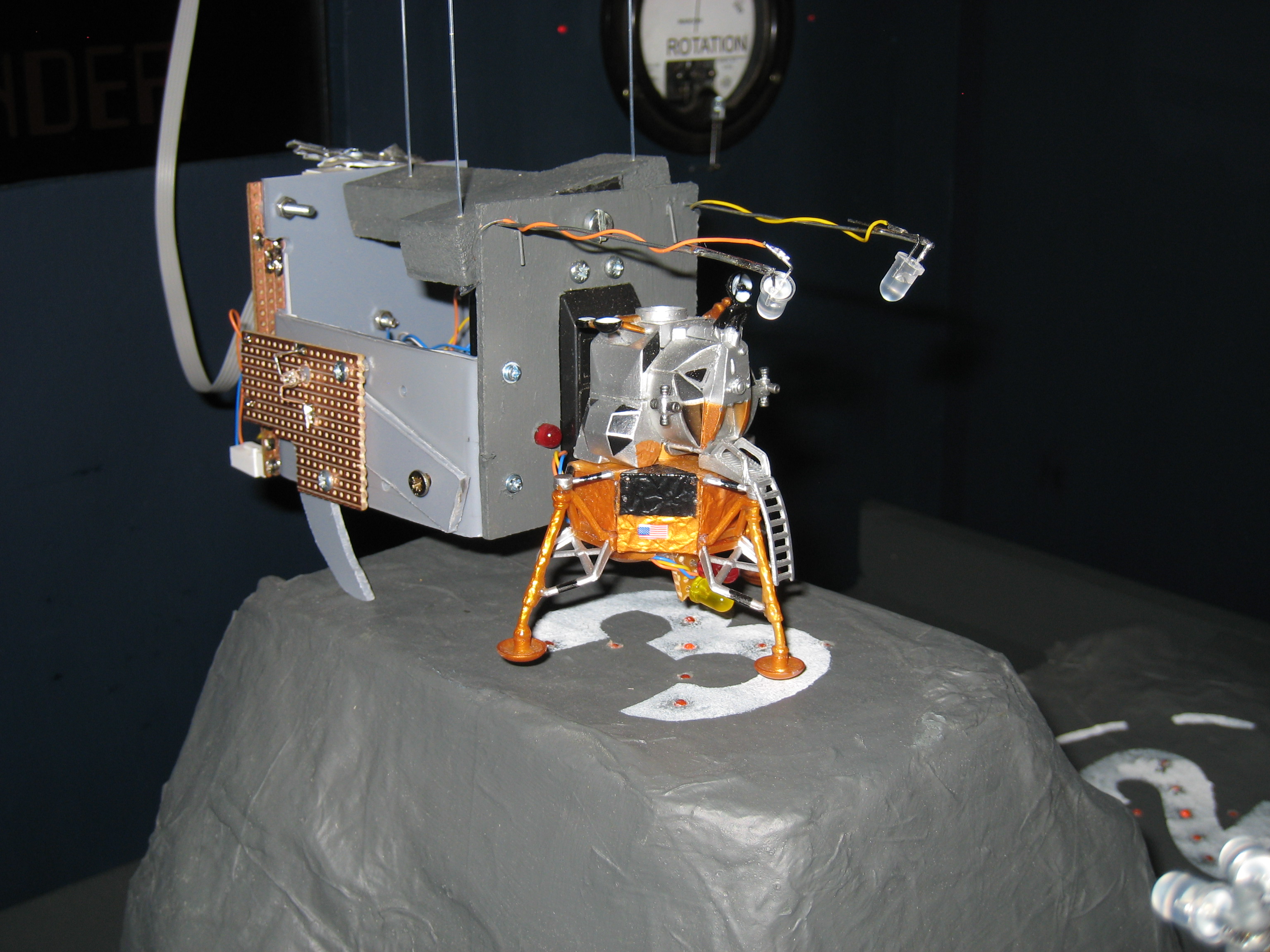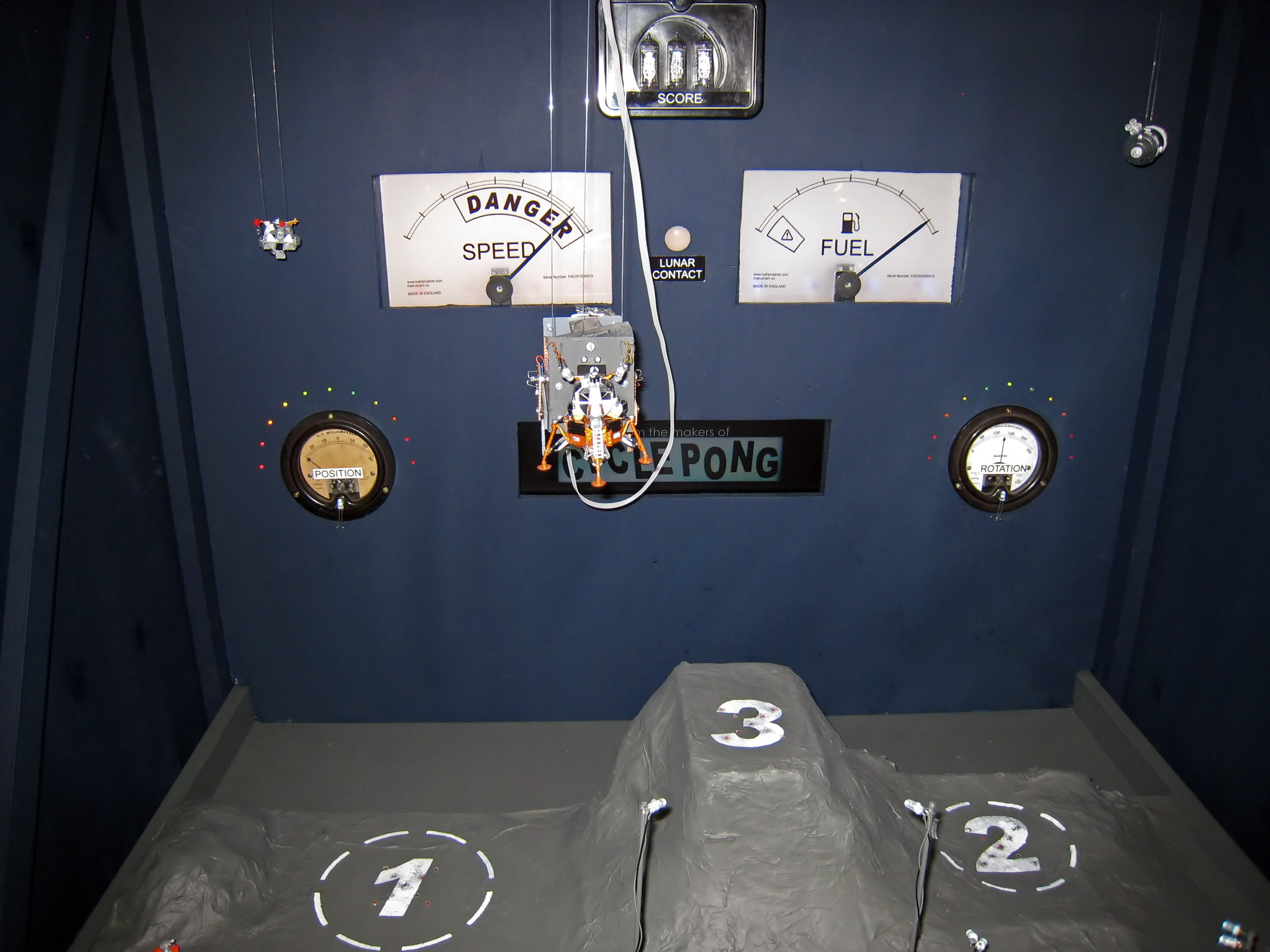 | Make it real Replacing Atari's vector graphics, my Lunar Lander is a model that hangs on fishing line and flys over a paper mache landscape. Stepper motors provide accurate control of the position and a servo controls the rotation. I won't claim the beautiful model making achieved by Thunderbirds, but the space-age look and visible wires certainly give it something of that feeling. Big dials (controlled by more servo motors) show the speed and fuel. These are backlit with LEDs that change colour when in the critical zone. Matching 'vintage' meters show the position and rotation of the lander model. Adding to the historical look there is a nixie tube display for the score. Lastly I couldn't quite get away without using a monitor, so there is a small LCD which has been masked off to give it an interesting aspect-ratio. A car steering wheel (actually from a 2 CV) is used to turn the lander with a simple button to fire the rocket. There is something magical about turning the wheel and seeing the model copy the turn. The best thing about showing the game is watching kids and adults getting transfixed. Having something real that moves adds something that the millions of pounds spent developing today's games can't match. With tongue in cheek the attract mode advertises "latest 3D technology". |