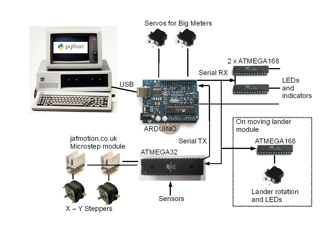 for the techies!) I started thinking about Lunar Lander and acquiring parts in spring 2008, and started making things in early winter. To have something that was portable and easy to test with, I started out with just the mechanism and landscape as a unit. This would just about fit in my study so I could do the software indoors over the winter. The working prototype was ready in time for Maker Faire UK in March 2009. Final construction of the arcade version went on until summer 2009. The electronics for Lunar Lander are based around ATMEL AVR microcontrollers. An Arduino board acts as a convenient USB to serial converter which makes the computer interface nice and easy. All the microcontrollers listen to a common bus from the Arduino. The circuit boards are hand-wired on stripboard or tripad except for the nixie driver which needed a PCB to make the connections to the valve base of the nixies. I was trying to make life easy for myself by using lots of off-the-shelf parts. There is some slightly clever stuff in the AVR software which makes the stepper motors run very reliably at the right speed even if the speed is being varied during the game. Infrared sensors are used to detect the limits for the system. On power-up the game does a calibration to find out the positions on all the limits. After this it relies mostly on the stepper motor counts being correct to measure the position of the lander. This seems to work fine - even over very long runs of many hours. The speed and acceleration of the stepper motors are controlled to make sure that no stalls or missed-steps happen. The intelligence for the game and overall control is done on a PC. To try and save time I used Python as the development environment with PyGame providing the game framework. I really enjoyed Python. The power of the language and the range of libraries do make it a good for doing lots of work quickly. The mechanical parts came from various DIY stores, online shops and car boot sales. Construction was done with normal DIY tools but I did invest in a few things to make this easier. An electric mitre saw is invaluable for making good cuts, and a high quality cordless drill and screwdriver really speed things up. During the testing the mechanics have stood up pretty well. We'll see how well they survive the continuous use on the pier. There is lots more Lunar Lander construction info on the blog. |