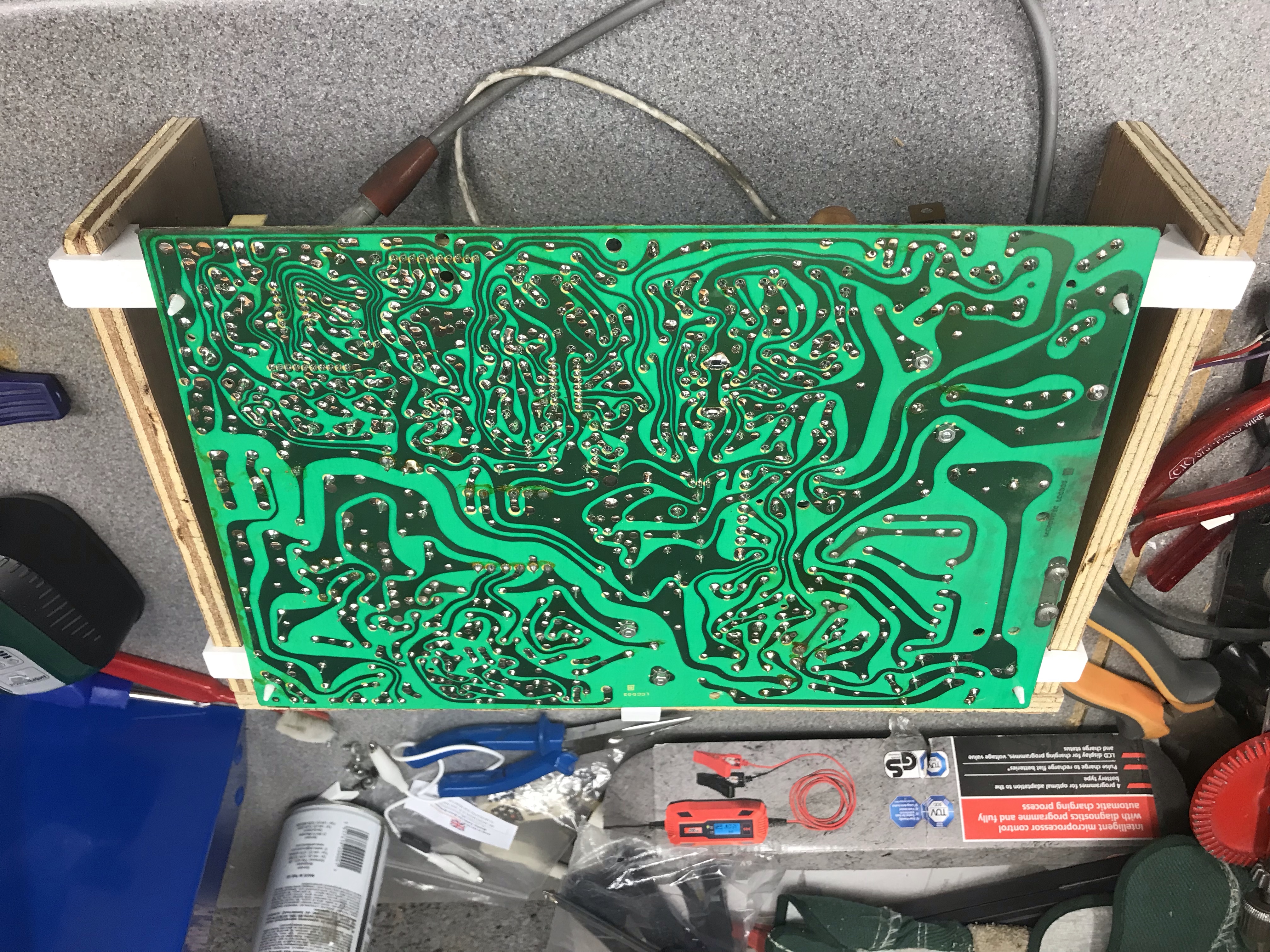 Replacing components on the Cub means removing the main PCB and working on the bottom of the board. As the PCB has many tall, fragile, components it is easy for these to be damaged if you just work on the PCB without supporting it off the desk. I designed a Jig to hold the PCB.