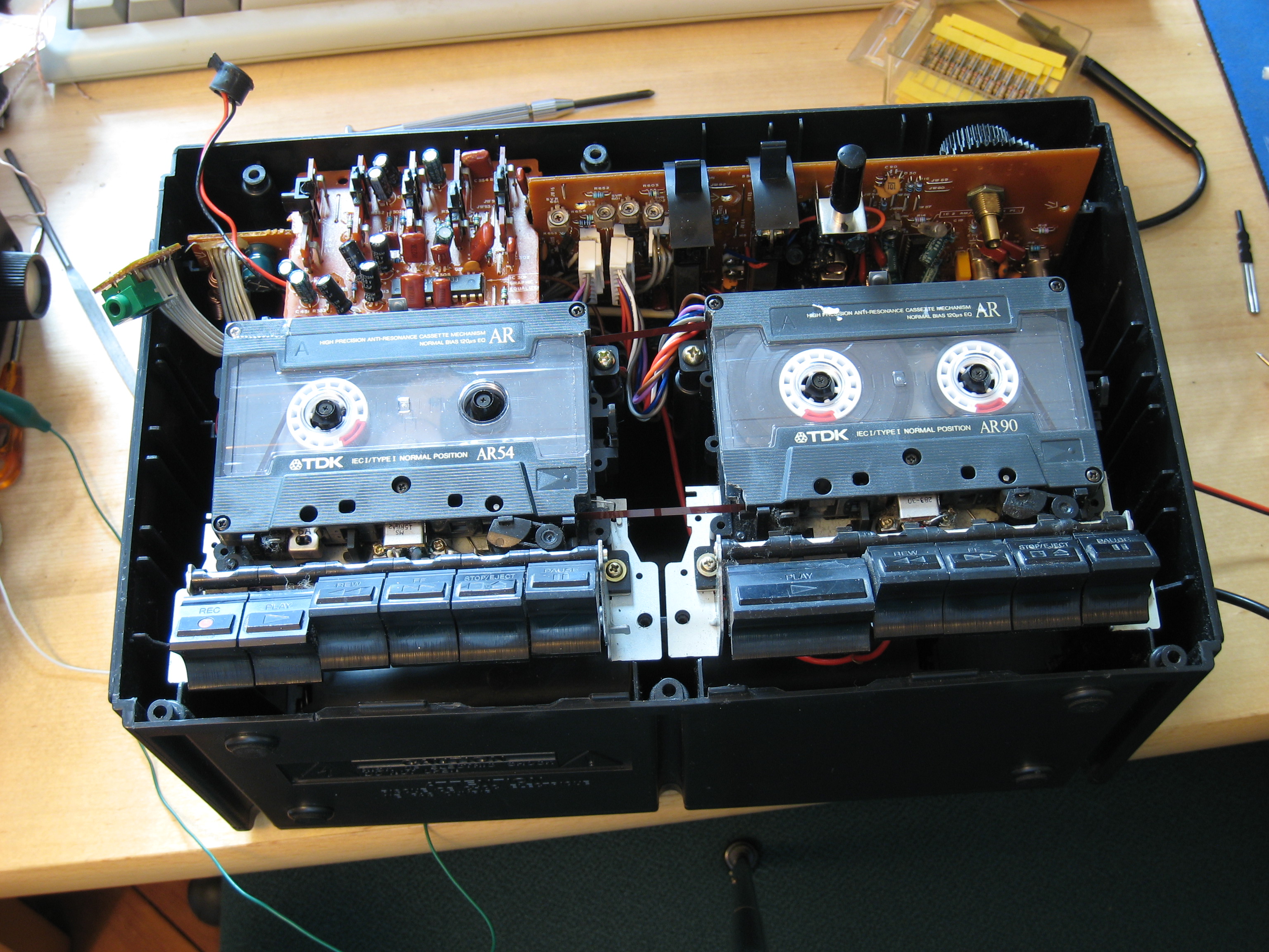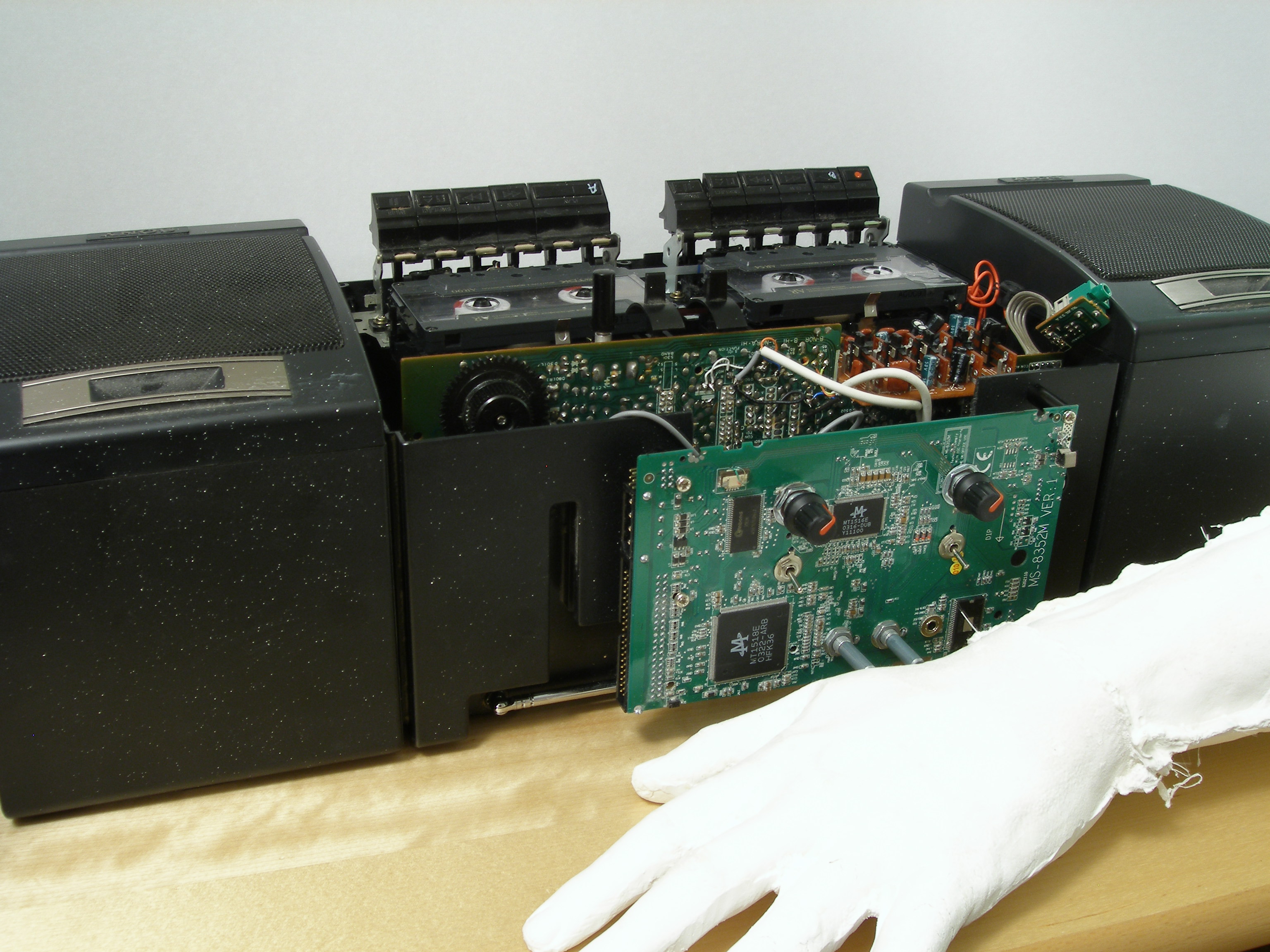 The second mod was to make a tape delay out of the two decks. The key point here was making a double cassette which allows one tape to be looped through both mechanisms. I then reversed the decks so that the machine recorded one one deck and then played back on the other a moment later.