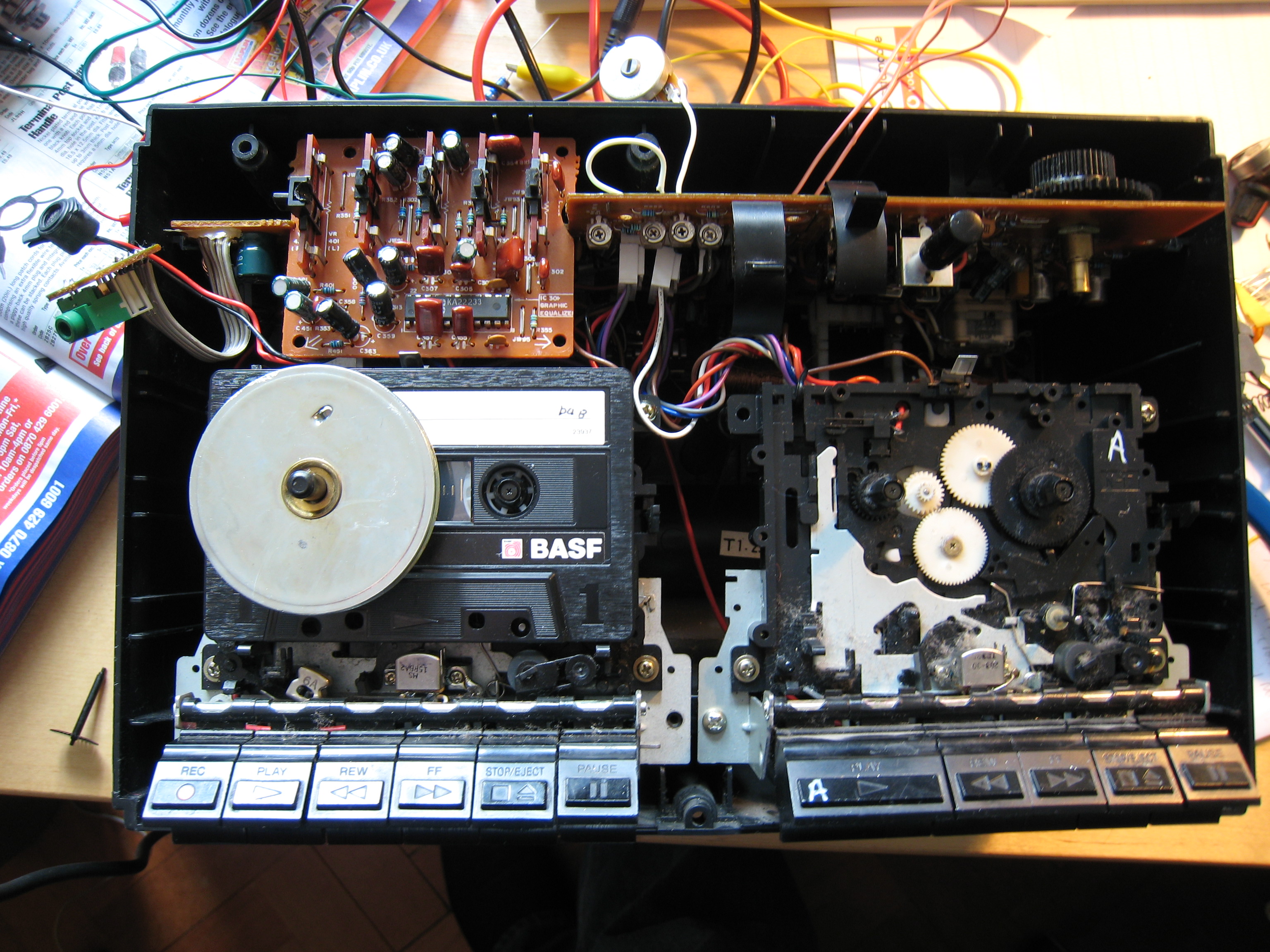 I've wanted to do a cassette deck hack for a while, so when a friend threw out his 80's ghetto blaster just before BurningDork 2007 it seemed too good an opportunity to miss.